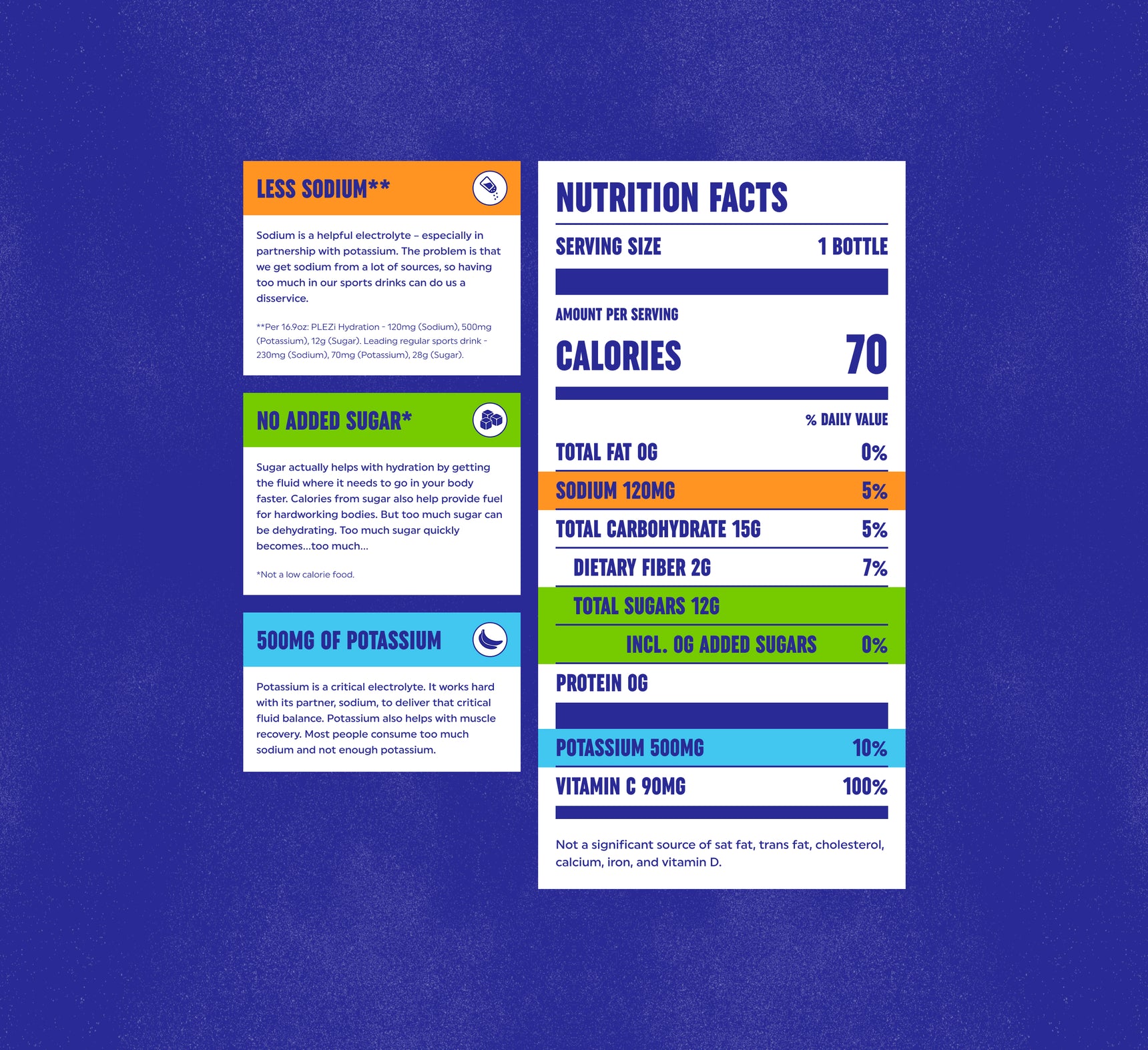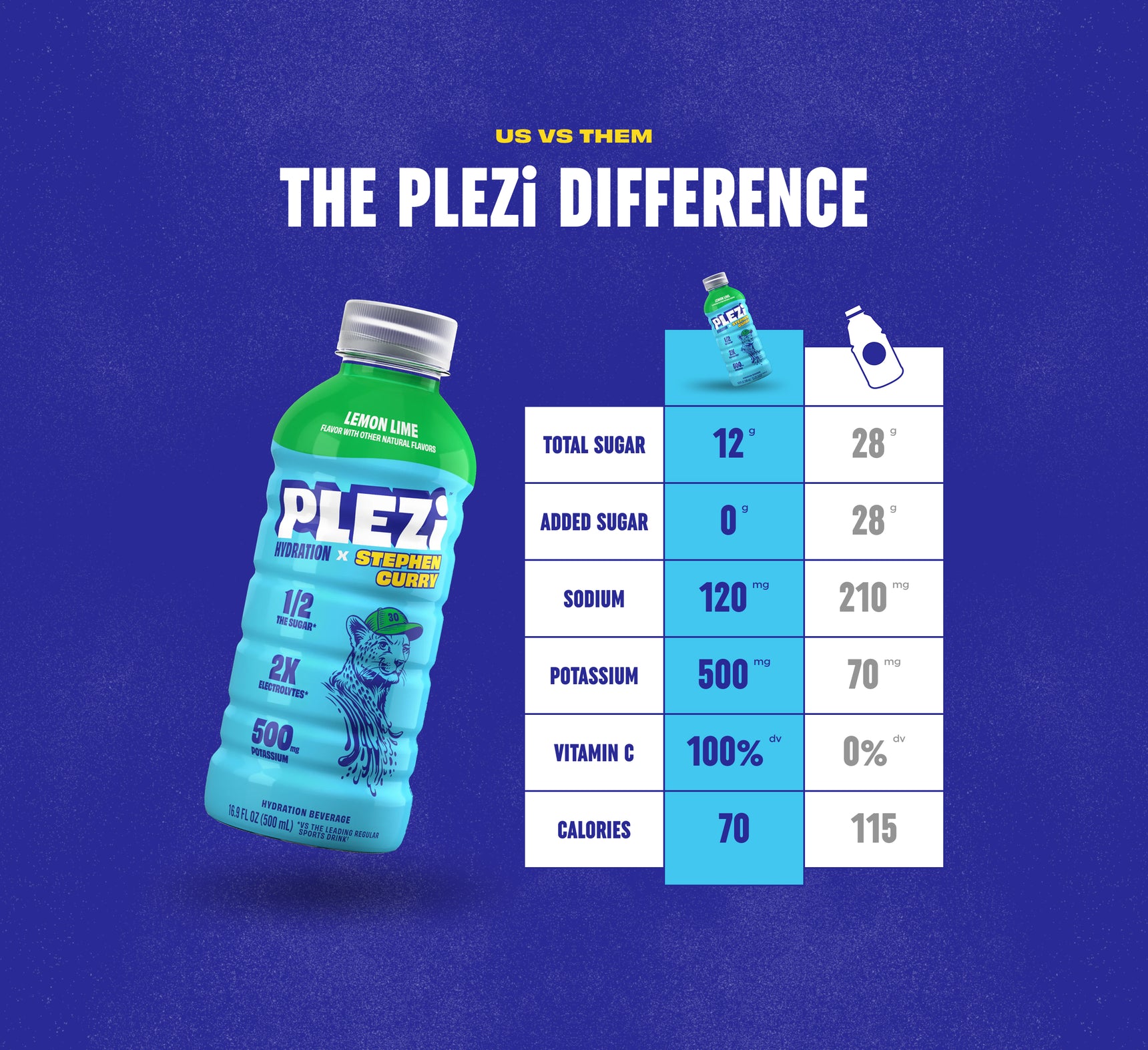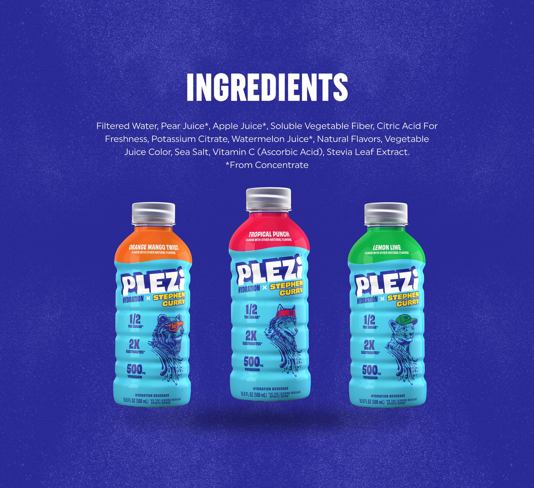 PLEZi Hydration is a healthier sports hydration drink purposefully designed with smart ingredients and unbeatable flavor. Created with NBA All-Star and PLEZi investor, Stephen Curry, PLEZi Hydration sets a new standard for how to hydrate with 2x the electrolytes* for performance, half the sugar*, and 7x the potassium* to help with recovery. No shortcuts—just bold flavor and hydration that keeps you going.